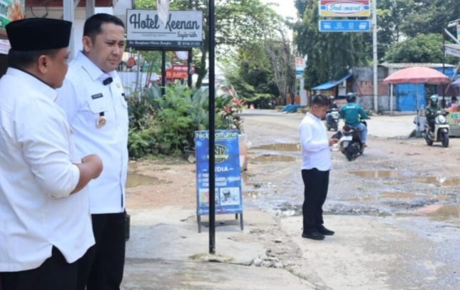 Canangjambi.com.Bangko-Bupati Merangin H M Syukur bersama Kadis Pekerjaan Umum dan Penataan Ruang (PUPR) Merangin Zulhifni, meninjau kondisi Jalan Rangkayo Hitam tepatnya di depan Hotel Keenan Bangko, Rabu (05/3).