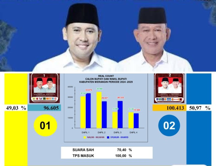 Hasilnya, rapat yang digelar sejak Jum’at (29/11/2024) itu menetapkan Paslon nomor urut dua (2) Syukur-Khafid (SUKA) sebagai pemenang Pilkada Merangin dengan perolehan 100.413 suara atau 50,96 persen.