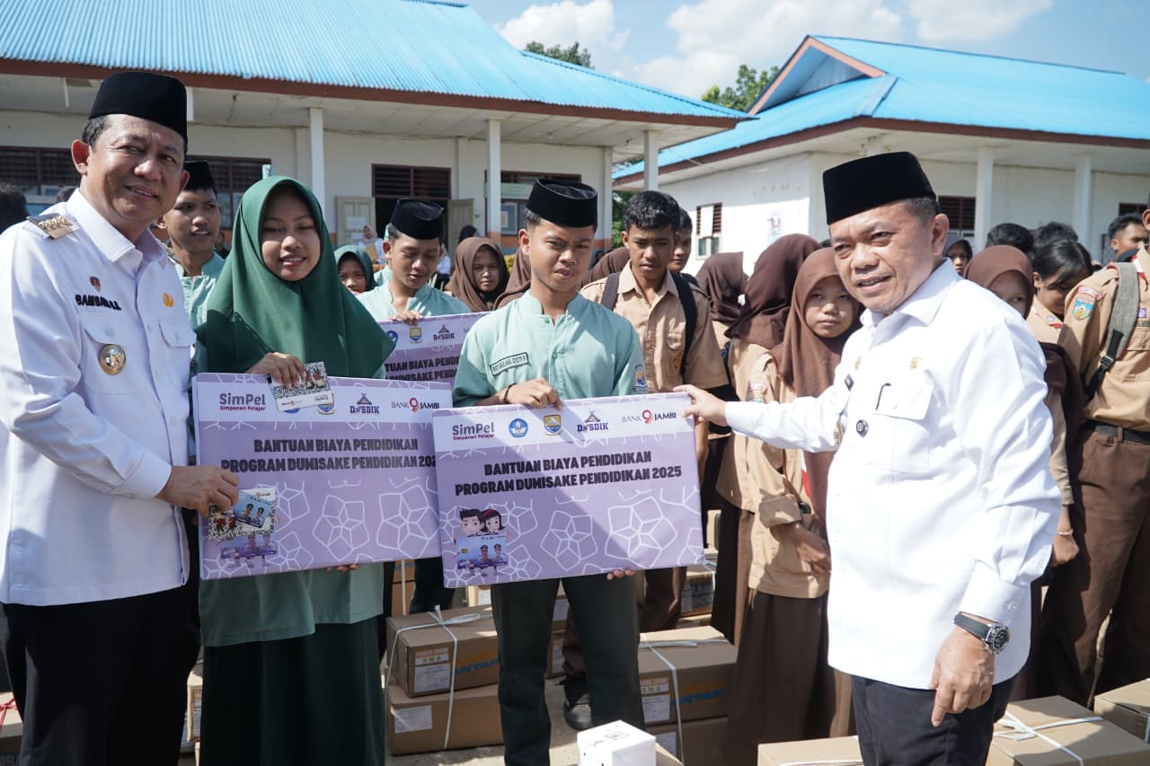 Sementara itu, Penjabat (Pj) Kepala Dinas Pendidikan Provinsi Jambi M.Umar MY, SE, MH menyampaikan, kegiatan penyaluran bantuan Dumisake untuk pendidikan jenjang SMA, SMK dan SLB tahun 2025 merupakan yang kedua, pertama sudah dilaksanakan di Kota Jambi, dan pada hari ini di Kabupaten Muaro Jambi. “Untuk keseluruhan alokasi Dumisake Pendidikan Tahun Anggaran 2025 berjumlah 5303 orang dan khusus untuk Kabupaten Muaro Jambi 466 orang untuk pelajar SMA, dan pelajar SMK, serta pelajar SLB. Selain itu, bantuan SPP kepada para pelajar yang bersekolah di sekolah swasta kepada 76 orang, selain itu juga bantuan berbentuk peralatan sekolah, buku, tas, pakaian sekolah dan sepatu,” ucap Umar.