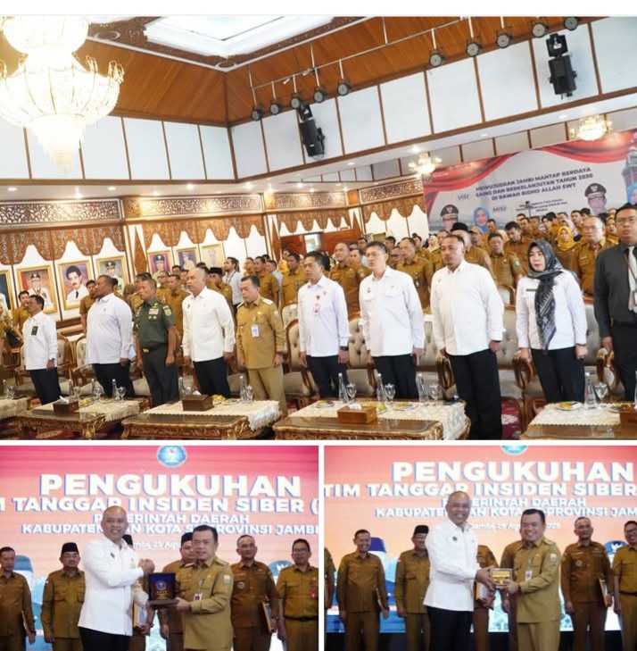 .Jambi–Gubernur Jambi, Dr. H. Al Haris, S.Sos., M.H., menegaskan bahwa pemerintah daerah, baik di tingkat provinsi, kabupaten, maupun kota, merupakan bagian dari simbol negara yang menyimpan data-data penting dan rahasia negara. Oleh karena itu, kebutuhan akan keamanan siber di era digital saat ini menjadi sangat krusial. Hal tersebut disampaikan Gubernur pada kunjungan kerja Kepala Badan Siber dan Sandi Negara (BSSN) Republik Indonesia Letjen TNI (Purn) Nugroho Sulistyo Budi, M.M, M. Han dalam Rangka Pengukuhan Tim Tanggap Insiden Saber (TTIS) pada Pemerintah Daerah Kabupaten dan Kota Se- Provinsi Jambi, bertempat di Auditorium Rumah Dinas Gubernur Jambi, Senin (25/08/2025).
