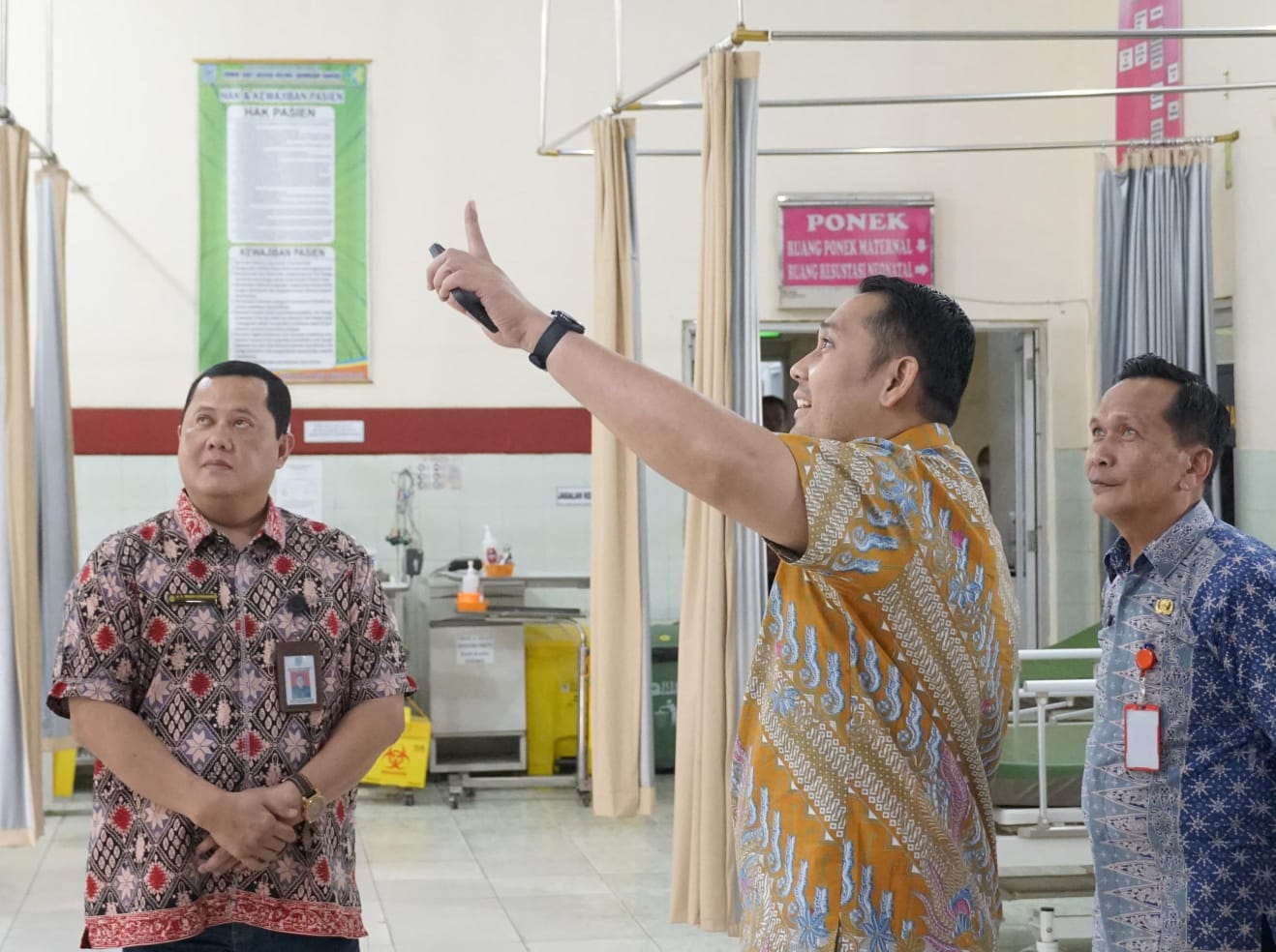 Begitu sampai di UGD, pandangan bupati terfokus pada plafon ruangan yang jebol. ‘’Sejak kapan plafon ini rusak,’’tanya Bupati kepada para perawat yang bertugas di ruang itu. ‘’Plafon itu rusak karena atapnya bocor Pak Bupati,’’jawab salah satu perawat.