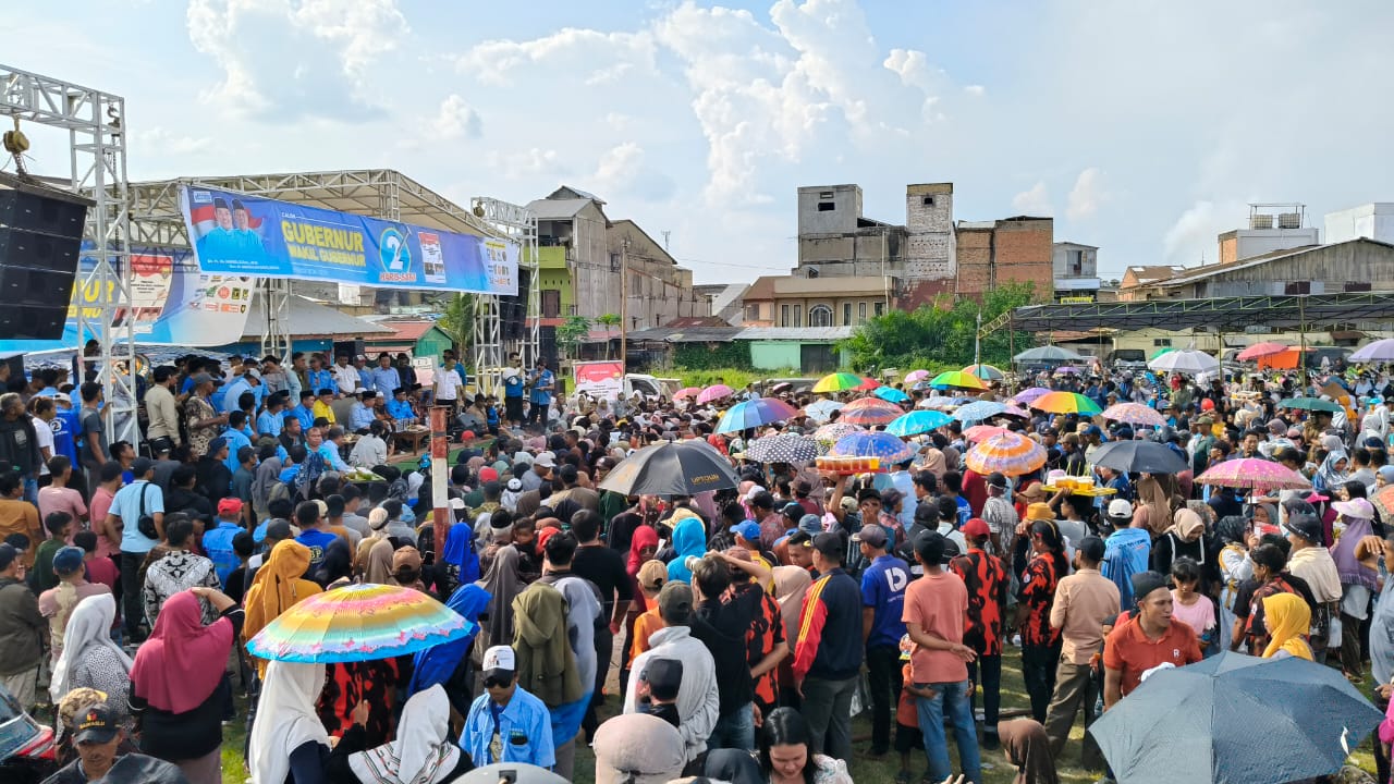 Com.Ribuan warga Kecamatan Tebing Tinggi, Kabupaten Tanjung Jabung Barat dan sekitarnya hadiri pertemuan terbuka dengan calon Gubernur Jambi nomor urut 2, Al Haris, Senin (11/11/2024) siang.