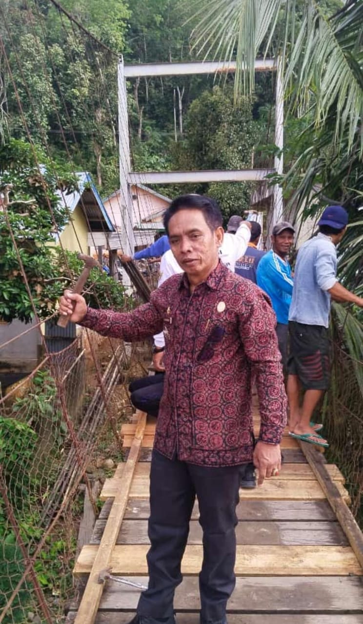 Bangko,-Jembatan gantung Desa Muara Kibul Kecamatan Tabir Barat rusak parah, Abd. Rahman S.P Camat Kecamatan Tabir Barat ambil langkah sigap, Ajak perangkat desa dan warga gotong royong bersama.